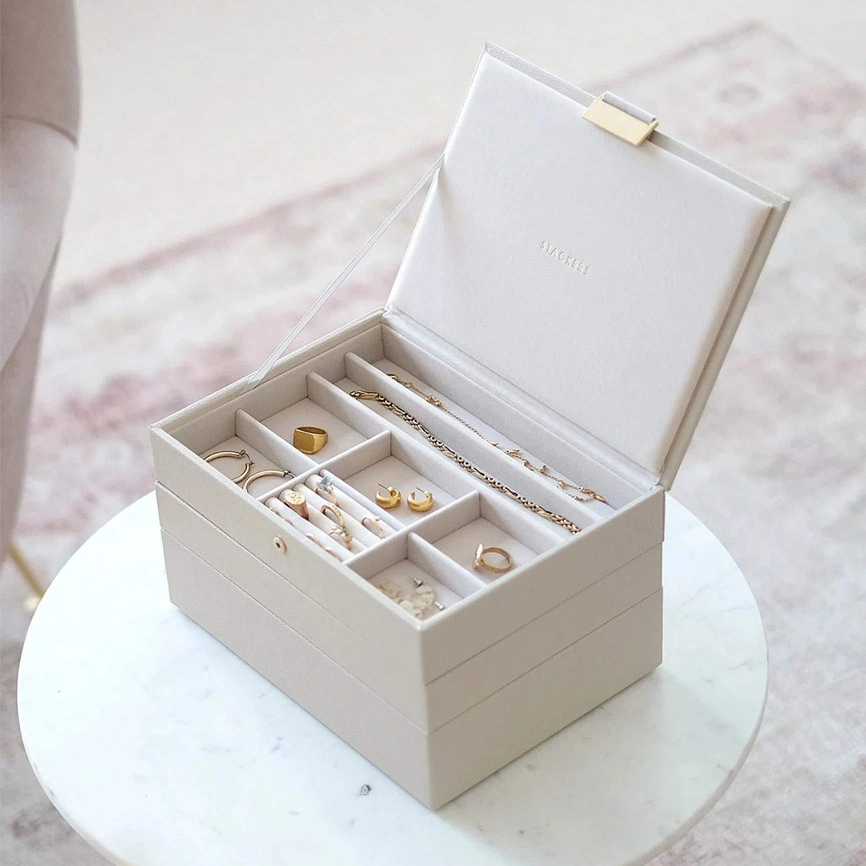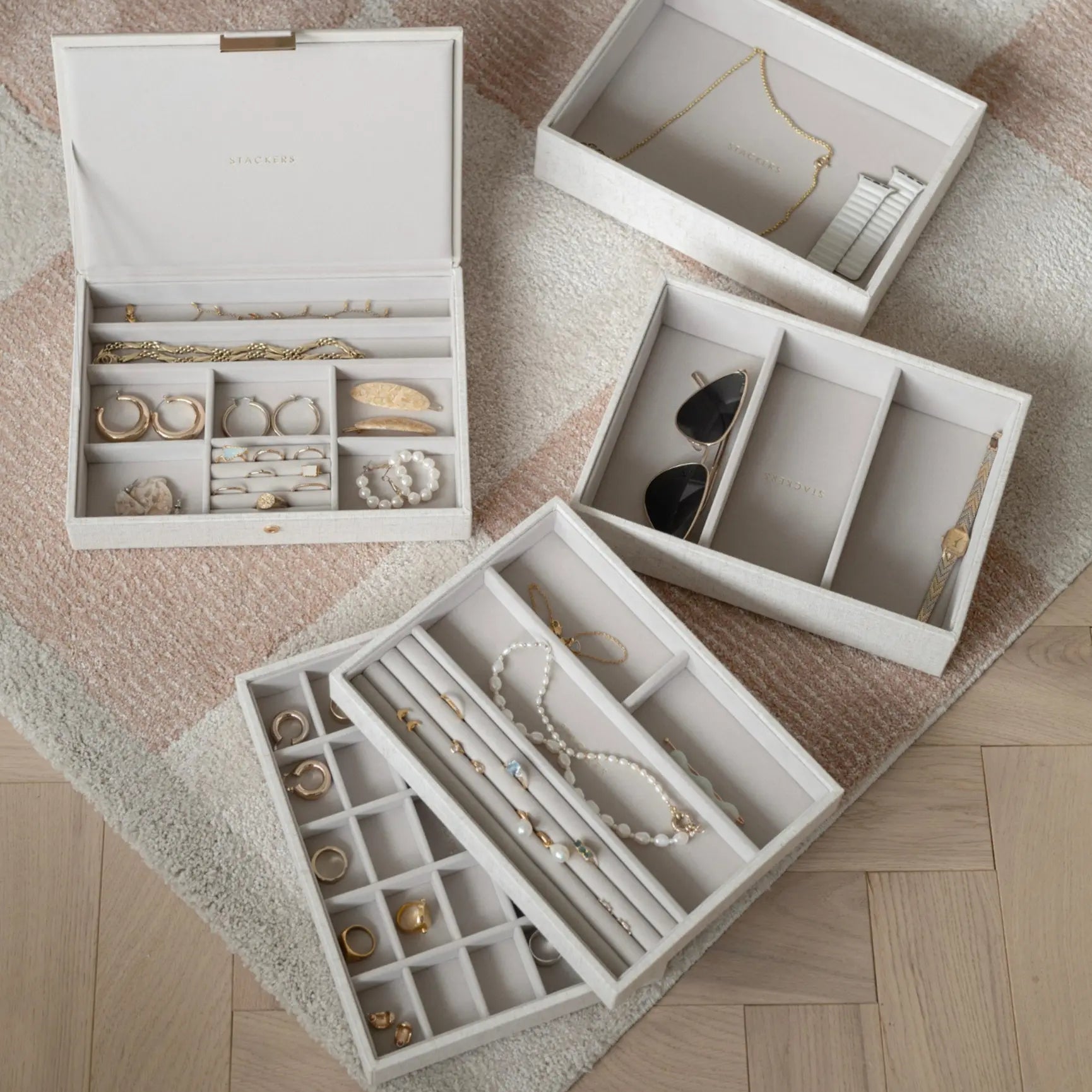 A jewellery box should grow with your collection. That's why STACKERS offers a modular and stackable system , allowing you to create your jewellery organizer exactly the way you want it. Start with a base layer and expand with additional layers, lids or drawers . Choose a mini jewellery box , a classic jewellery box or a spacious XL jewellery box , and add extra compartments for rings, necklaces or watches later. Thanks to this flexible design, you can create a personal jewellery solution that fits your collection perfectly. View the collection of layered jewellery boxes or discover the XL layers and lids for a personalized storage solution.